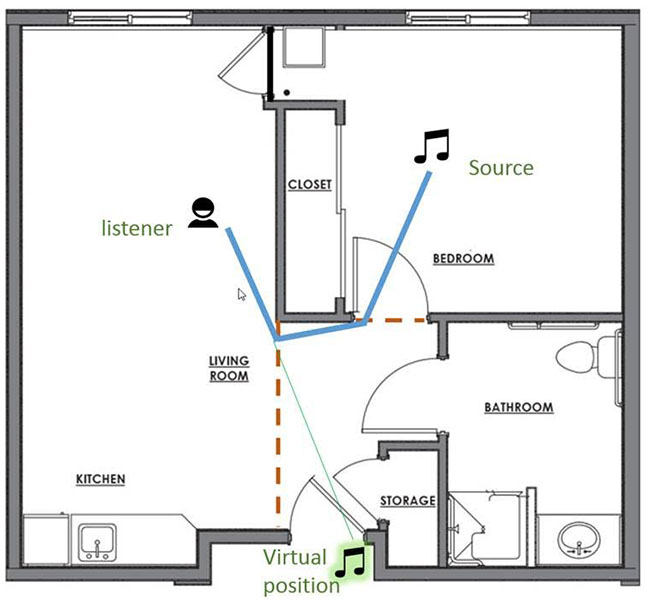 例如,如果墙壁完好无损,墙内的传播节点算法就不可用。但是,如果在墙上开了一个洞,那么最近的节点将让传播路径进行选择,而是否会让声音通过则具体取决于受影响的区域。然后我们会重新定位声音以反映路径的方向,而不是模拟衍射声源的最终实际位置。
